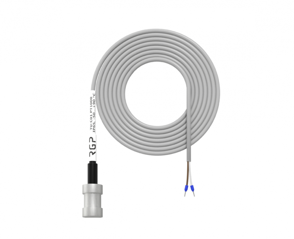 Контактный (поверхностный) датчик температуры с PT1000 для измерения температуры труб/поверхностей; монтаж — крепление к трубе/поверхности.