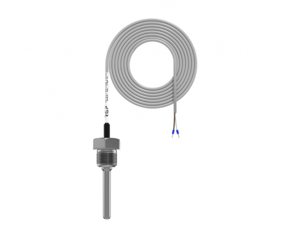 Погружной датчик температуры с чувствительным элементом NTC 10 kΩ (β=3950) для измерения температуры жидкостей (вода/гликоль); монтаж — гильза/врезка, трубопровод/резервуар.