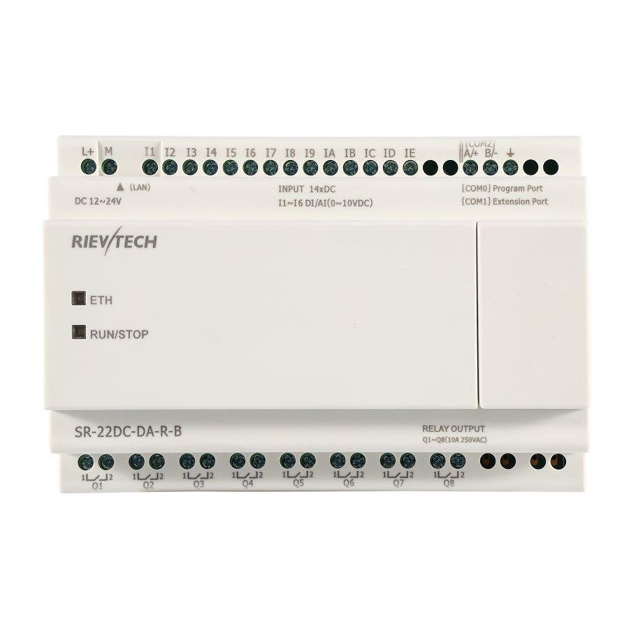 SR-22DC-DA-R-B — компактный ПЛК без дисплея, работающий от 12–24 В DC или 24 В AC. Контроллер оснащён 14 дискретными входами (6 из них могут работать как аналоговые 0–10 В) и 8 релейными выходами на 10 А. Поддерживает программирование на FBD и Ladder, протоколы Modbus RTU и Modbus TCP через интерфейсы RS485 и Ethernet, а также расширение до 3 дополнительных модулей.