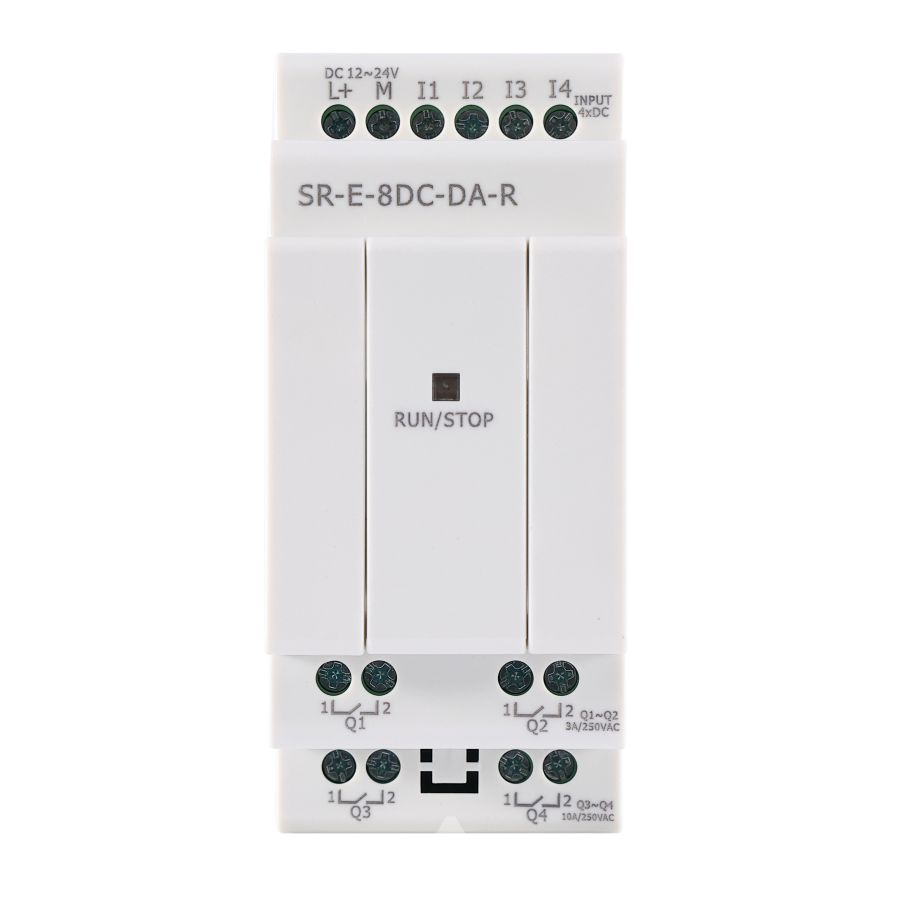 SR-E-8DC-DA-R — модуль расширения для контроллеров серий SR и PR, работающий от 12–24 В DC. Оснащён 4 универсальными входами (цифровые/аналоговые 0–10 В) и 4 релейными выходами, среди которых два на 3 А и два на 10 А. Используется для увеличения числа входов/выходов в системах автоматизации.